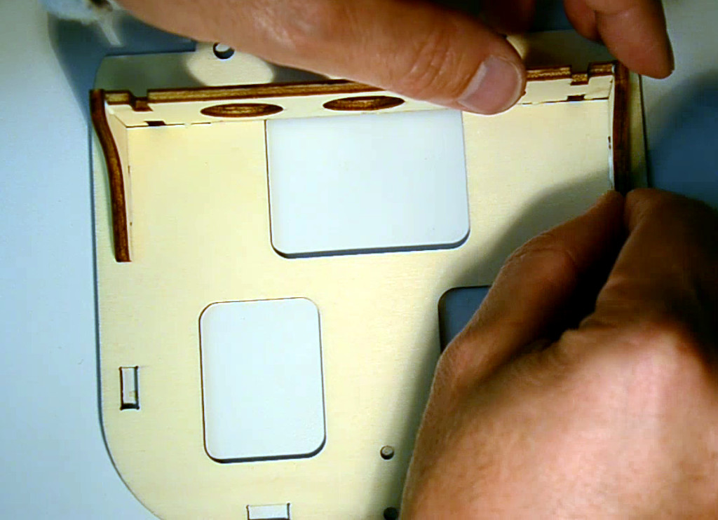 - Abdeckung vorne leimen: Schmauchspuren innen. Am Schluss im der grossen Frontplatte (ohne anzuleimen!) trocken lassen, damit es auch passt.