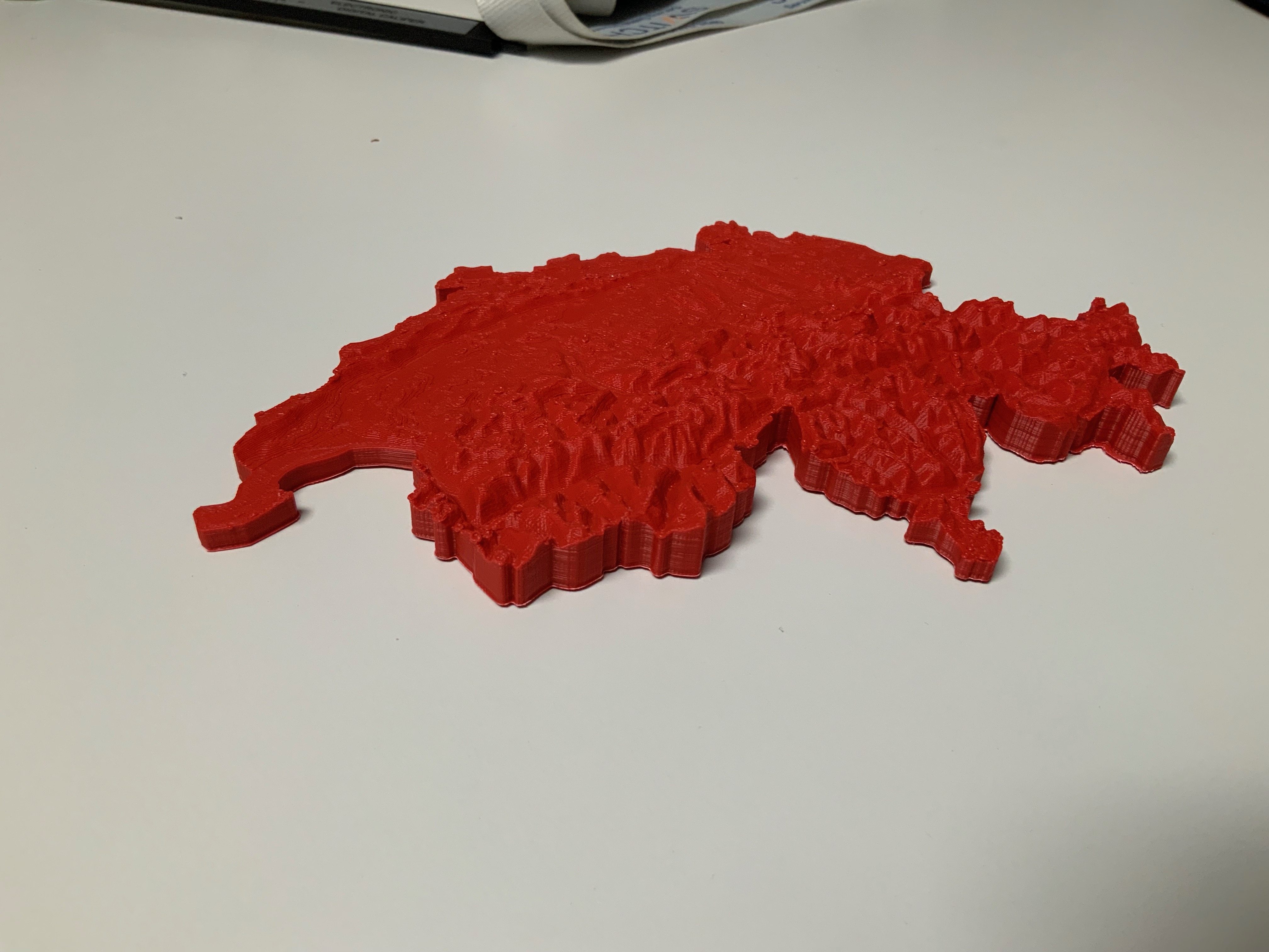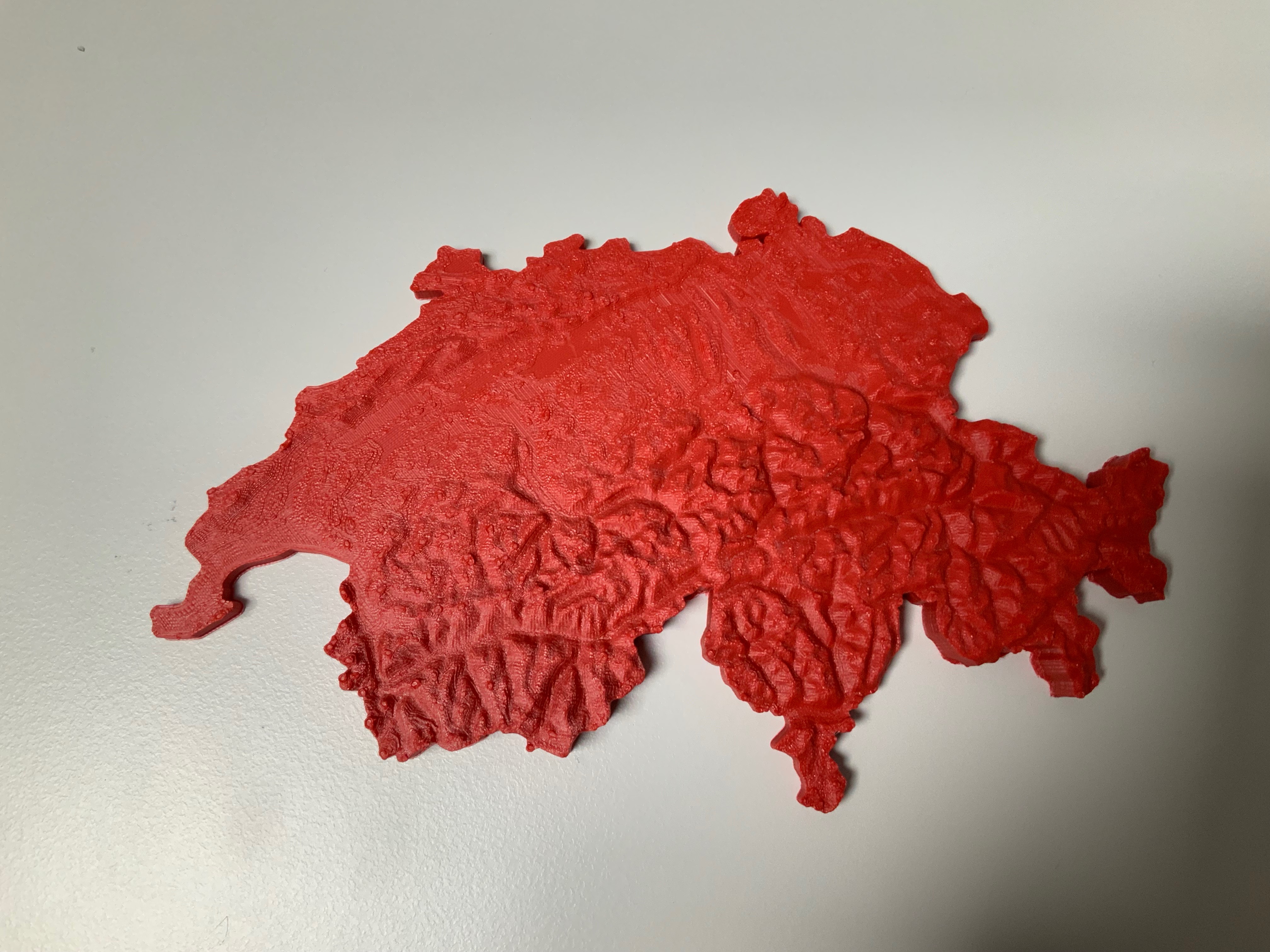 3. Auf tinkercad.com: Beide Dateien importieren, die Negativ-Form als “Hole” definieren, die beiden passend übereinanderlegen und gruppieren. Das ganz ist je nach Dateigrösse, Computerleistung und Internetverbindung eine recht zähe Sache. Am Schluss sollte das in der Form angepasst Relief vorliegen, welches exportiert und im Slicer (ich verwende Cura) slicen.